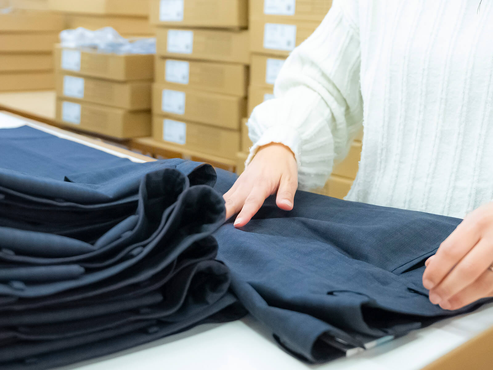 衣料品の検品や補修・仕上げを行っています。